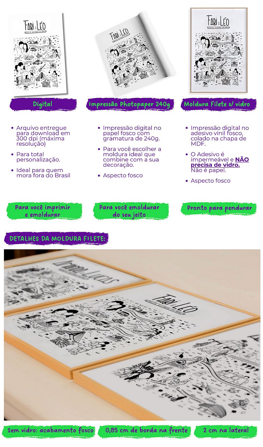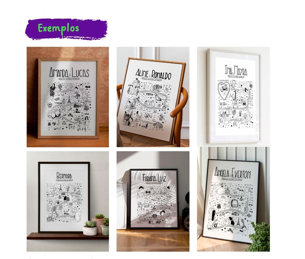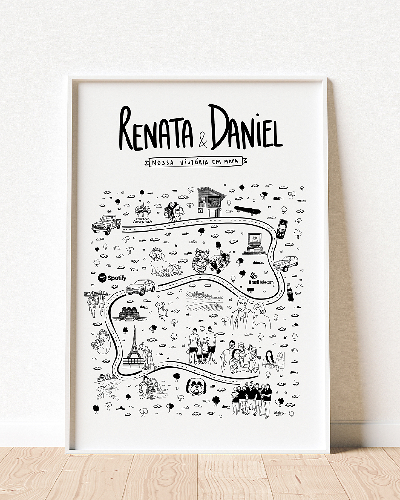 Após sua compra você receberá um e-mail com um formulário e um passo a passo das informações necessárias para a criação. Lugares que marcaram sua vida ou seu namoro, pets, viagens, e situações que te tiram um sorriso, tudo isso pode virar um mapa!